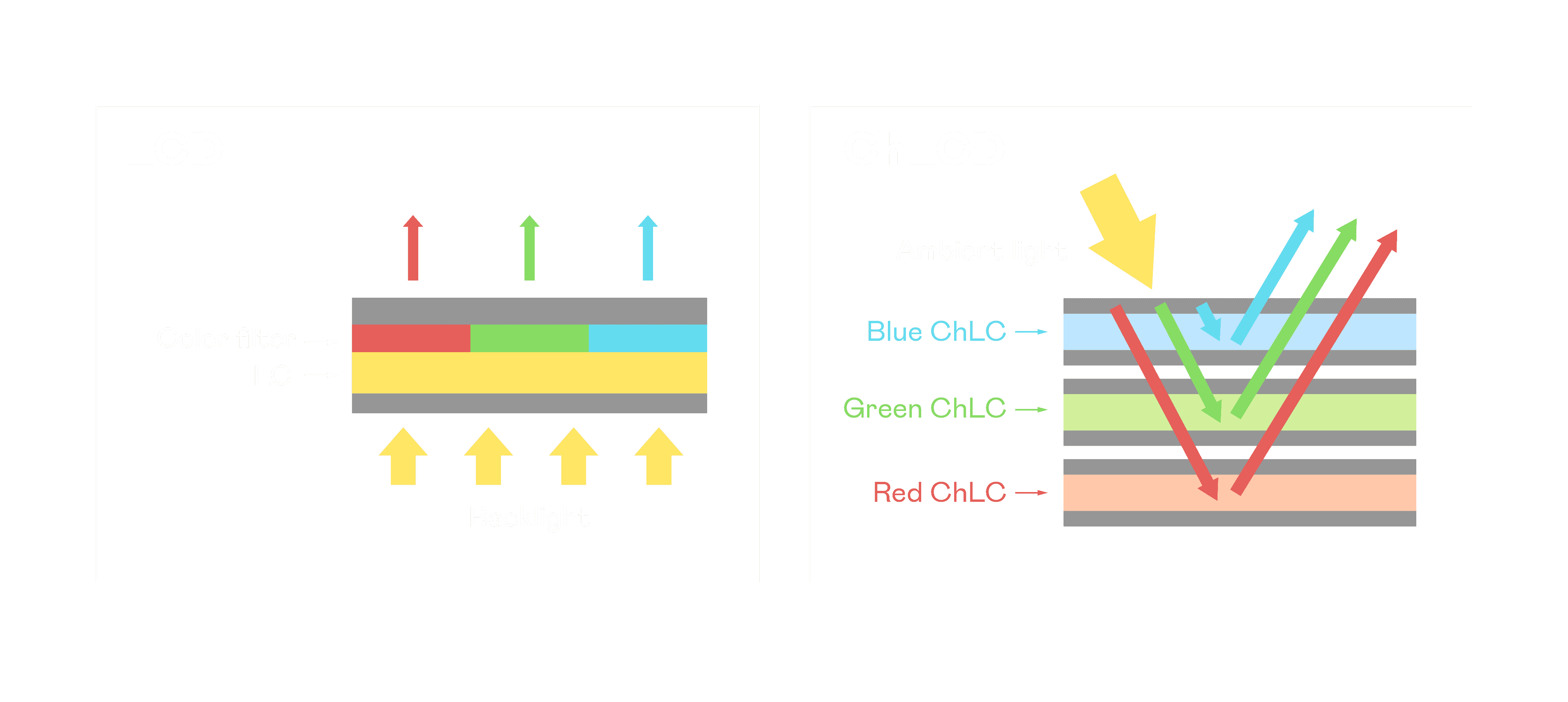 ChLCD 胆固醇液晶就如同纸张一样,,透过反射环境光来显示影像,,,因此长时间观看不易造成人眼视觉疲劳,,可达到护眼效果。。。当处于户外阳光下使用,,,LCD 影像容易失真而不易观看,,,,但胆固醇液晶仍可维持较佳的影像品质。。。